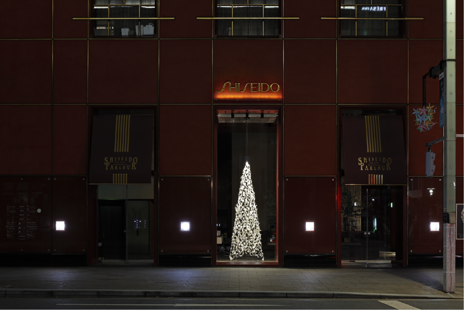 この素材はやがて自然へ還る生分解性を持ち、役目を終えても再び土や海水へと循環します。装飾には、資生堂の伝統とも言える唐草模様で構成。上へと螺旋を描くもみの木の姿に呼応し、過去から未来へと伸びていく生命力を表現しました。