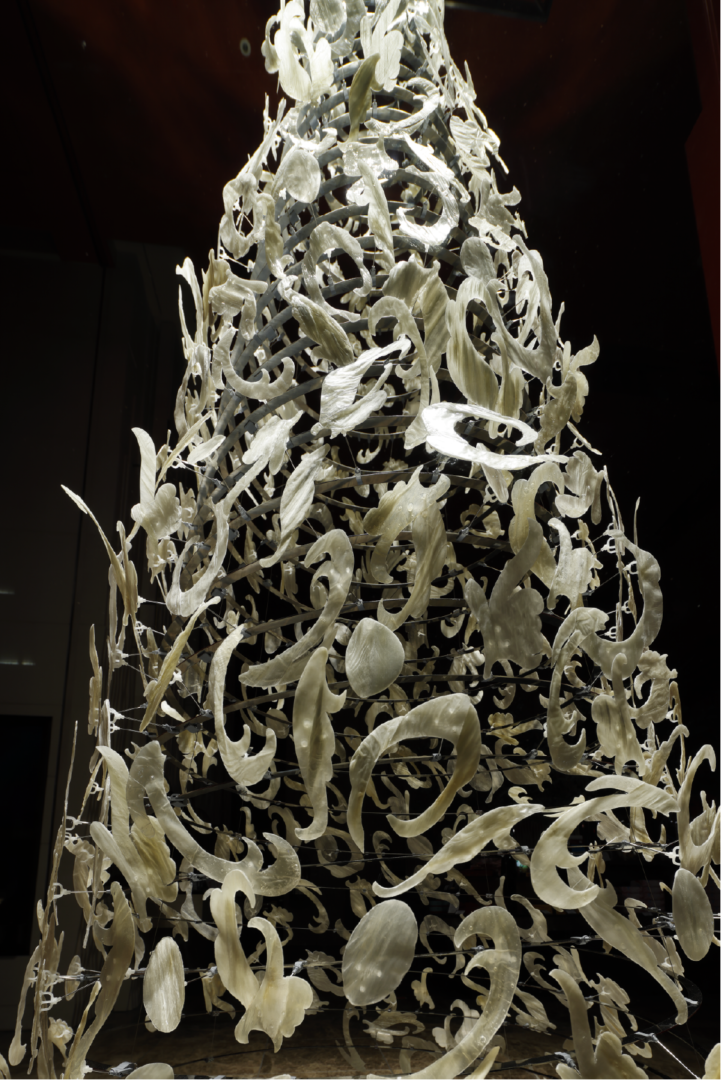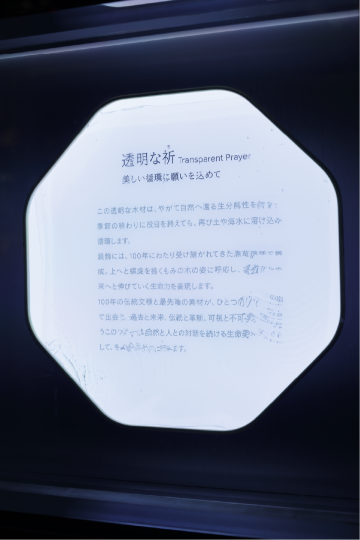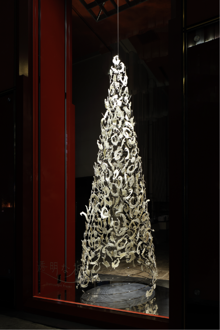 資生堂みらい研究グループ独自の技術を応用した「透明木材」を用いたオーナメントを集積した、美しい循環に願いが込められたツリー型のデザインです。